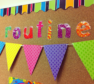 | bought some funky letters but made my own little flags ( with patterned paper, a hole punch and ribbon!) |