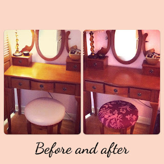 Hi folks! I hope everyone is enjoying these first days of summer! I took last weekend to catch up on some projects that I’ve been putting off. So what was first on the list? Covering up that old pink bench I had in my bedroom! Now my vanity has a beautiful bench with velour flowers and birds on it! Hooray!