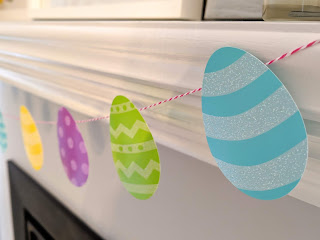 Hi there! Easter is just around the corner so I decided to finish decorating my mantle this afternoon. This year, I added a little egg garland, since I had egg cutouts left over from my classroom decorations. Looks great with our usual bunny sculpture and bunny print. Hooray!