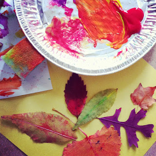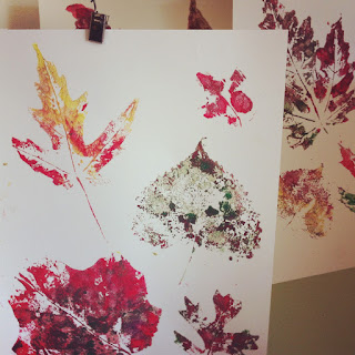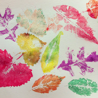 Sponge paint onto a leaf (not too thick!). Turn it over onto a piece of paper and gently place a piece of newsprint paper on top. Gently push rub to make a nice impression. Remove the piece of newsprint and carefully lift up the leaf. Voilà! You have a fancy leaf print. Now repeat as many times as you want and fill up your whole page!
