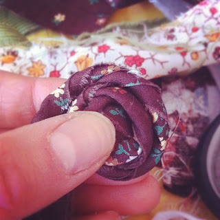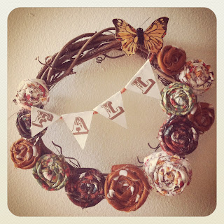 Today is a perfect Fall day AND I have the day off… so why not make a Fall craft!? Time for a new wreath! I used fabric scraps to make little rosettes, but no sewing is required! Just a glue gun! Simply follow this step by step tutorial I found online!