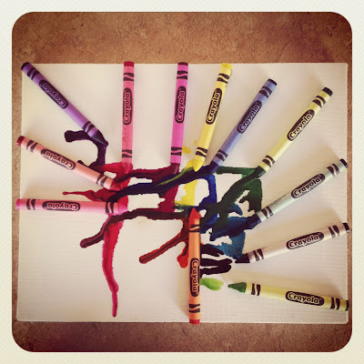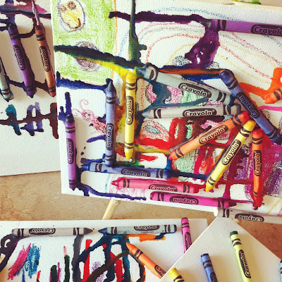 Look how wonderful this turned out! We let the kids pick pout their crayons, draw a little on the canvas and place the crayons however they liked on the canvas (we hot-glued them on for them.) Then we just melt them with a heat source… and voilà! Awesome abstract, pop-art-esque original artworks!