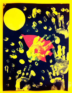 FINGER-PAINTING! Kids (and grownups sometimes) looove it. Look at this cute project we did the other day. It was one of my favorite during my July contract at a new school. It’s an outterspace collage and the stars are painted with fingers! Cute