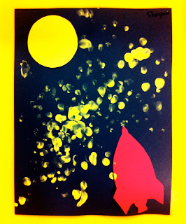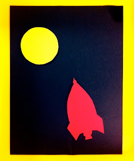 | Step 1: Pre cut moons and rocket ships. Glue them on the black construction paper. |