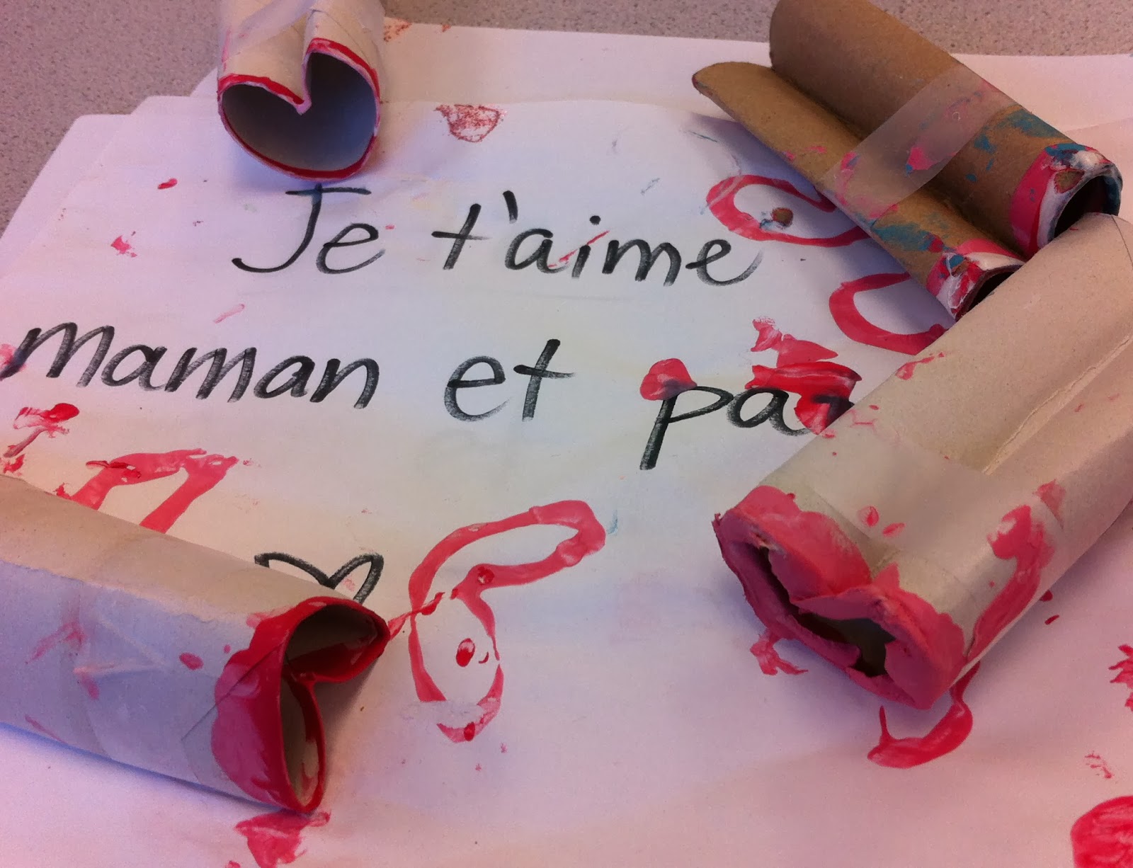 Hi again! I just wanted to show you the fun things we made for mom & dad in class for valentine’s day. We did two fun project! “Je t’aime” (that’s french for I love you!) heart stamp cards and mini frames with heart fingerprints! so simple but BEAUTIFUL!