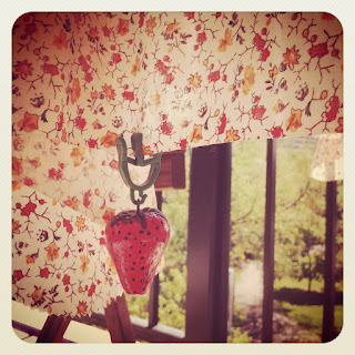| Table cloth cut from some vintage fabric! And some cute weights from the dollar store so that it won’t fly away! |