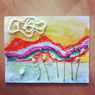 For this craft, we talked about landscapes in general and the Group of 7. All I did before-hand was draw two line on each piece of white cardstock: one for the water, and one for the mountains. The kids were free to create after that!