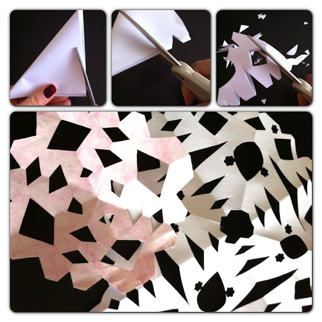 The fun part… cutting! Start by trimming the long edge of the triangle in order to end up with an even cone shape (see above). cut shapes  along the 3 edges of the snowflake. Make sure to avoid cutting the folded edge completely, or else you’ll end up with a bunch of triangles! Open and voilà! Magic! It never gets old! I even put some up in the window of my apartment!