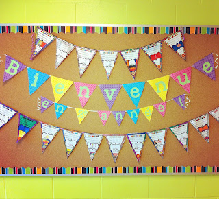 | bought some funky letters but made my own little flags ( with patterned paper, a hole punch and ribbon!) |