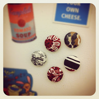 Instructions: Simply cover buttons in fun fabric (button-covering kits can be purchased at fabric or craft stores and look like this) snip the back off with pliers and super-glue on a magnet! Hooray! Makes perfect little gifts too…..