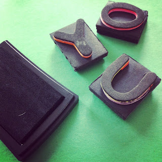 Hi there! Want a way to create cheap letter stamps you can use with kids?! I bought some adhesive foam alphabet letters from my local craft store (about 1″ tall) and mounted them on a piece of foam core (thick cardboard would work too! think cardboard box thickness). They were perfect for our “I ♡ you” monster cards!
