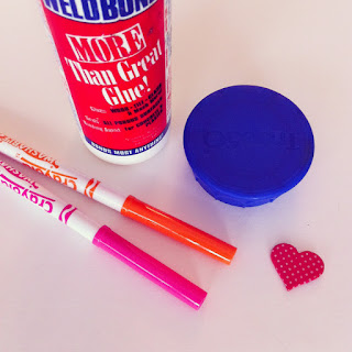 Valentine’s Day is coming up and I started thing about some fun crafts. This morning I played around with stamping, making my own homemade heart stamp. All you need is an old plastic bottle lid, a foam shape and some glue! Super easy and cheap!