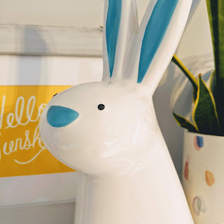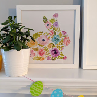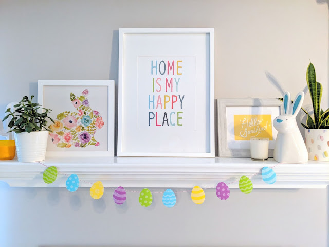 Hi there! Easter is just around the corner so I decided to finish decorating my mantle this afternoon. This year, I added a little egg garland, since I had egg cutouts left over from my classroom decorations. Looks great with our usual bunny sculpture and bunny print. Hooray!