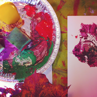 Sponge paint onto a leaf (not too thick!). Turn it over onto a piece of paper and gently place a piece of newsprint paper on top. Gently push rub to make a nice impression. Remove the piece of newsprint and carefully lift up the leaf. Voilà! You have a fancy leaf print. Now repeat as many times as you want and fill up your whole page!