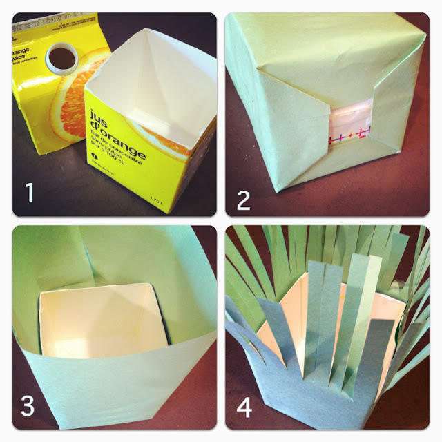| Step 1: cut the top off a juice or milk carton. Step 2: Cover it with green paper (like you’re wrapping a gift) Step 3: Fold the paper on the bottom but leave about 4 inches sticking up from the top. Step 4: Cut the paper sticking out into strips, to look like grass |