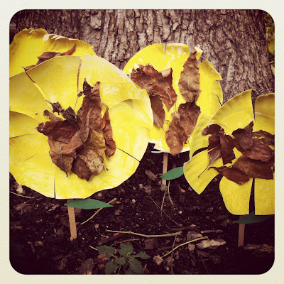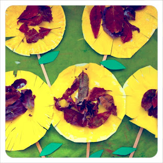 New school year = new crafts! Hurray! I’m so excited for all the new projects that await us this year! Today, in  honour of our new beautiful season – Fall –  we created some adorable paper sunflowers. And what did we use for the brown middle part?! Dried brown leaves!! Perfect! Wanna make one?