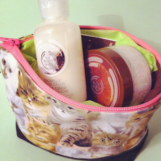 Hi there!I had a fun time sewing a little gift for my Friend yesterday! Ibought her a wonderfully smelling coconut giftset at the body shop, but wasn’t crazy about the little pouch it came in, so I thought: why not make her one?! I remembered that she LOVED my kitty cat fabric last time we had craft day together, so i thought: purrrfect! (haha!) So here it is, how to personalize a giftset with some handmade goodness!