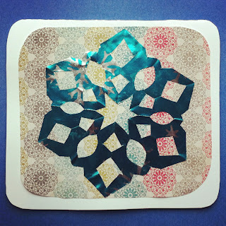 Determine the size of your cards and fold a piece of cardstock in half. Glue some scrapbooking paper for the background and paste the snowflake on top! Voilà!