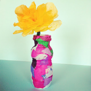| Then, apply some glue (or Podge) to the bottle with a paint brush and paste some pieces of tissue paper. When the vase is covered, give it another coat of glue to seal it! |